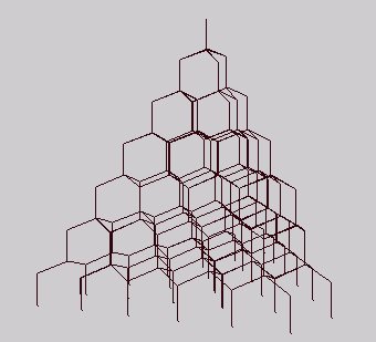 The positive and negative T-path lattices, superimposed, outine all the couplers, and therefore we might say: Although some compact recursive algorithm would get us more unique T-paths with less redundantly visited vertices, and hence a smaller output file, I've already got the randomly walking 4D Logo Turtle strategy, and so get more observable results in less time with something more like the computer program listed below [2]. For those of you with browser-enabled embedded VRML, the output of the random fall algorithm is at right (you'll need to rotate the image to get the 'top' oriented as per the above 'gravity' logic). Imagine glass cylinders, hexagonally packed, under each exit from the apparatus at bottom. We'd expect a pile of beads in a hill, higher towards the center, sloping down to the edges of the triangle, reaching their lowest at the vertices, each fed by one unique path out of the many T-path options. Instead of a 'bell curve' we might talk about a 'bell hill' with bell curve profiles seen from the sides. The probability or frequency with which a bead will end up in a given cylinder is given precise numeric expression by the Pascal-method of adding all nodes feeding to a given one (by branch pipe), to give a growing triangle of sums, highest numbers towards the center. These sums count the total number of unique T-paths feeding any given node within our apparatus. This same counting method may be used in the IVM, with each of the 12 spheres surrounding a nuclear one having a value of 1. At the next level, we start getting Pascal-like aggregates in the 8 tetrahedral and 6 octa- hedral directions. The sums in each sphere would give the number of T-paths to that sphere, along IVM segments only, and stipulating no 'sideways' movment i.e. each hop has to be to a cuboctahedral layer one further outward from the nuclear sphere. NOTES[1] David Chako defines T-space as the set of all points reachable by incremental translations in the four v-ray directions (center of a regular tetrahedron to its four vertices), along with the T-paths between them. These hops are assigned the coordinates (1,0,0,0) (0,1,0,0) (0,0,1,0) and (0,0,0,1) where vector addition is defined e.g. (0,1,1,1) + (1,1,1,0) = (1,2,2,1), along with a simplest form of coordinate address: at least one coordinate zero, all others non-negative e.g. (3, 2, 1, 1) simplifies to (2, 1, 0, 0) (0, 0, 0,-1) --> (1, 1, 1, 0) (1, 2, 2, 1) --> (0, 1, 1, 0)T-paths are the routes traced by moving in T-space as per the four v-ray intervals. These paths define a space-filling arrangement of hexahedra, or one-quarter rhombic dodecahedra, as described above. For a more detailed and recent investigation of this topic, see my Introduction to Quadrays. Some curriculum writings at the Math Forum give more context for this research into Pascal's Tetrahedron. I also have an essay on the Binomial Theorem featuring Pascal's Triangle. *-------------------- procedure randomwalk4 lparameters depth * written in Microsoft Visual FoxPro by K. Urner * (Turtle class source code not shown here) * this whole procedure gets called 500 times, * to statistically explore the expanding tree * of possibilities to a depth of 6 =rand(-1) && reseed the randomizer oTurtle.penup() oTurtle.setorigin() && back to the top oTurtle.pendown() oTurtle.mov(1,1,1,0) && drop the bead down the apex for i=1 to depth vdir = mod(int(1+1000*rand()),3)+1 && options 1-3 (not 4) oTurtle.movi(vdir) && indexed movement operator oTurtle.mov(1,1,1,0) && fall straight down to next choice endfor oTurtle.writevrml() && append to the VRML ascii file return *-------------------- |